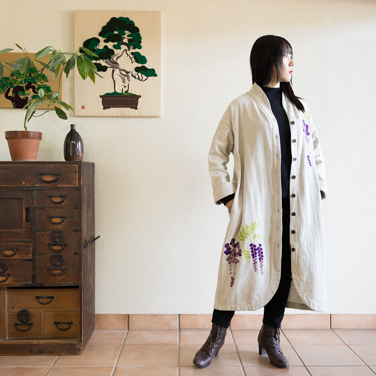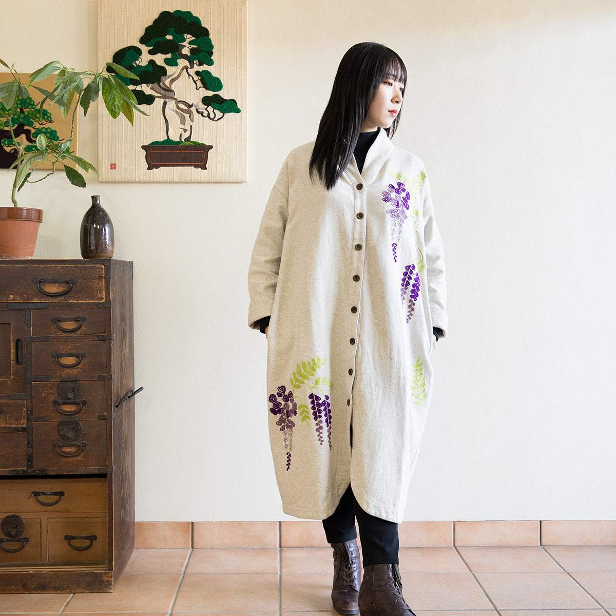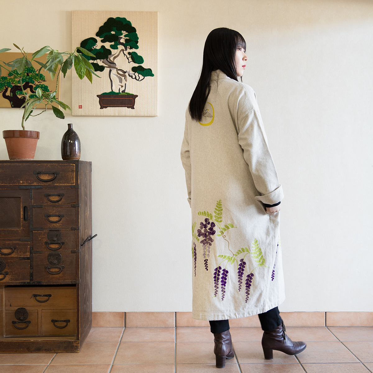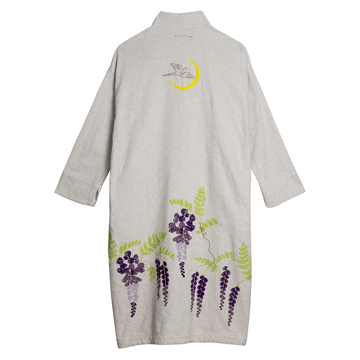 A long coat in soft-hued cotton tweed, embroidered with wisteria in chain stitch. On the back, a motif of the moon and a cuckoo is embroidered. Simply drape it over your shoulders for an elegant and refined look.