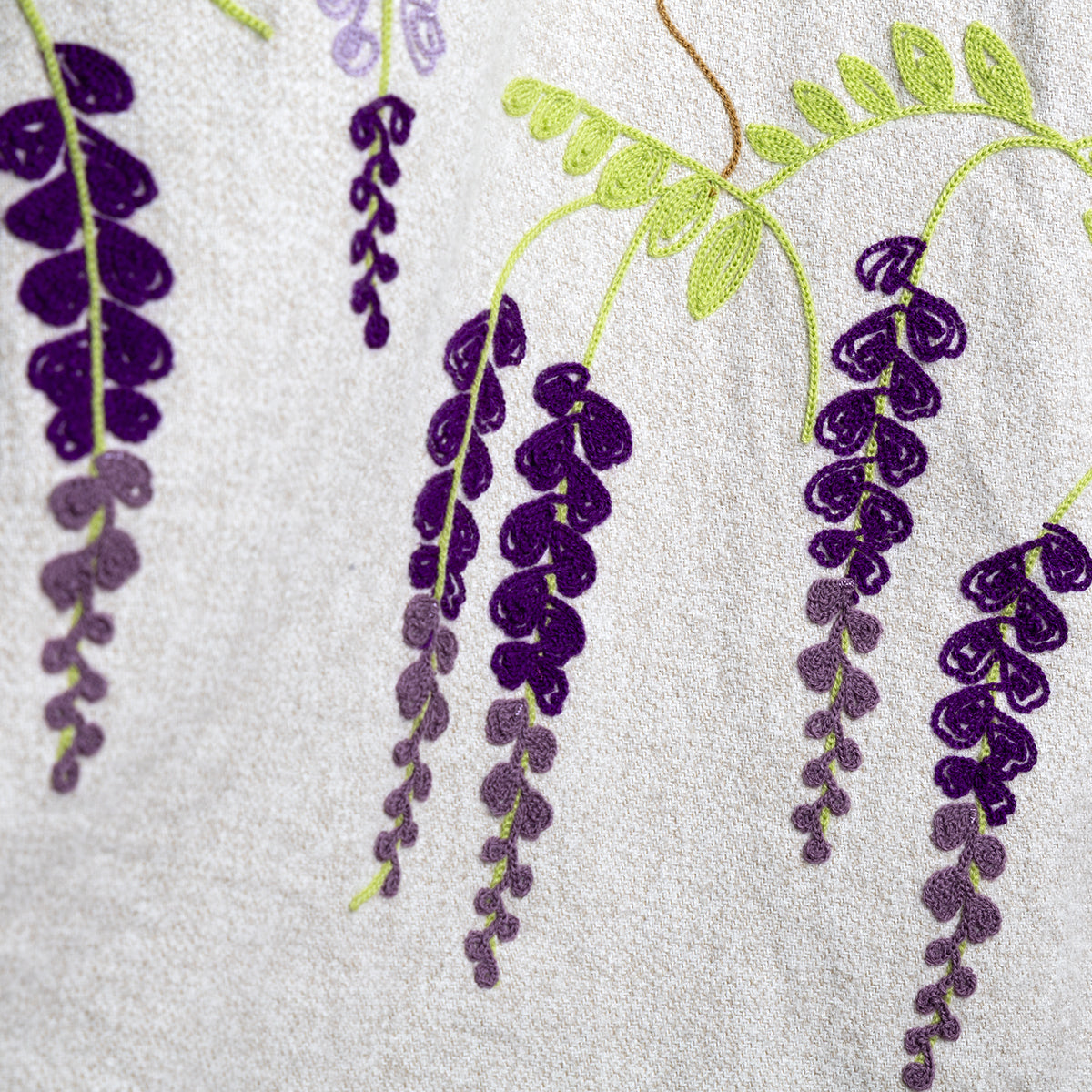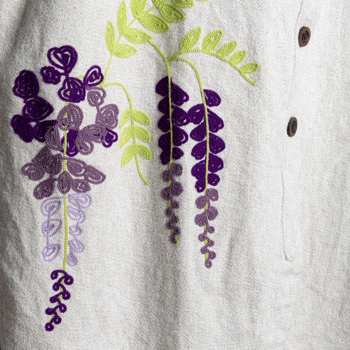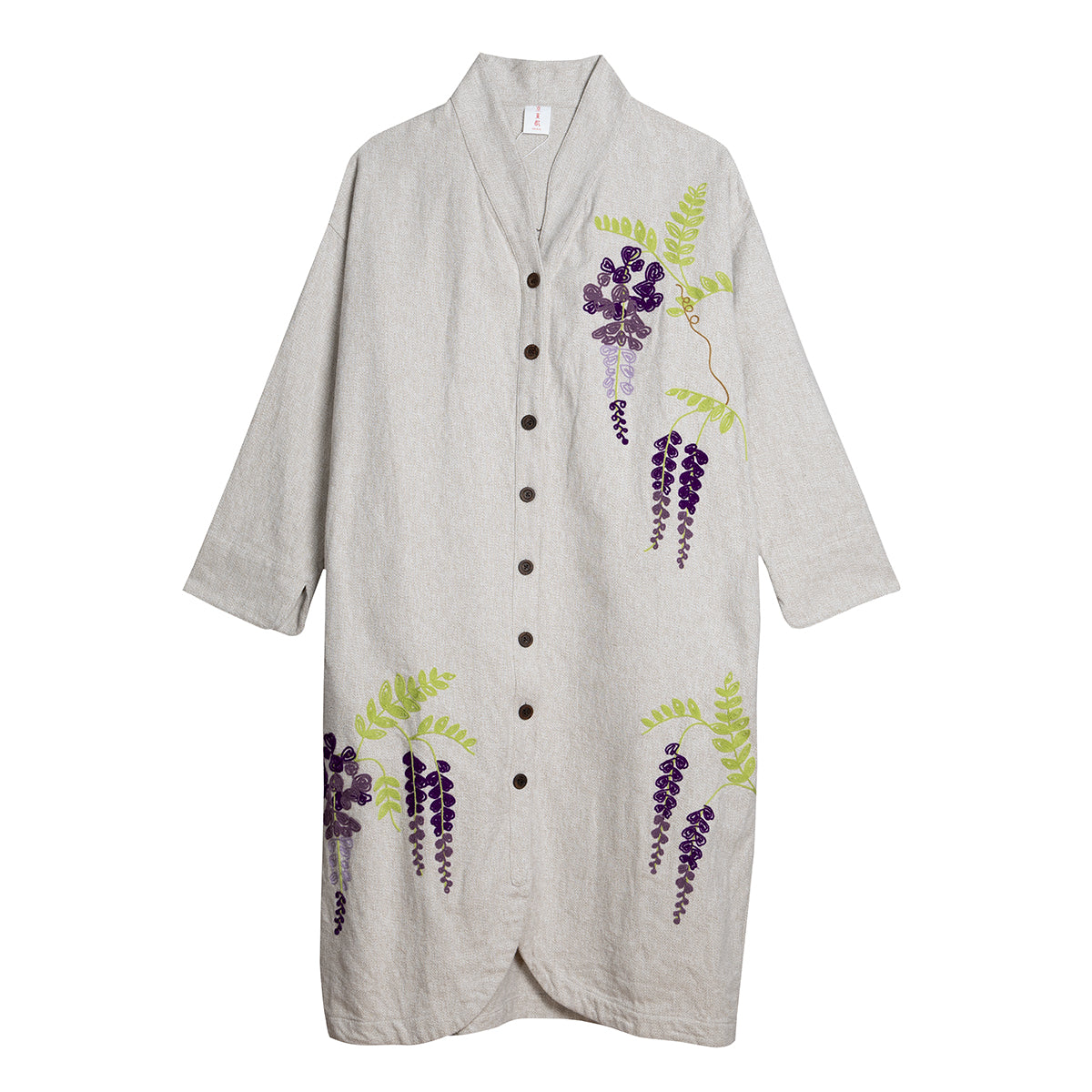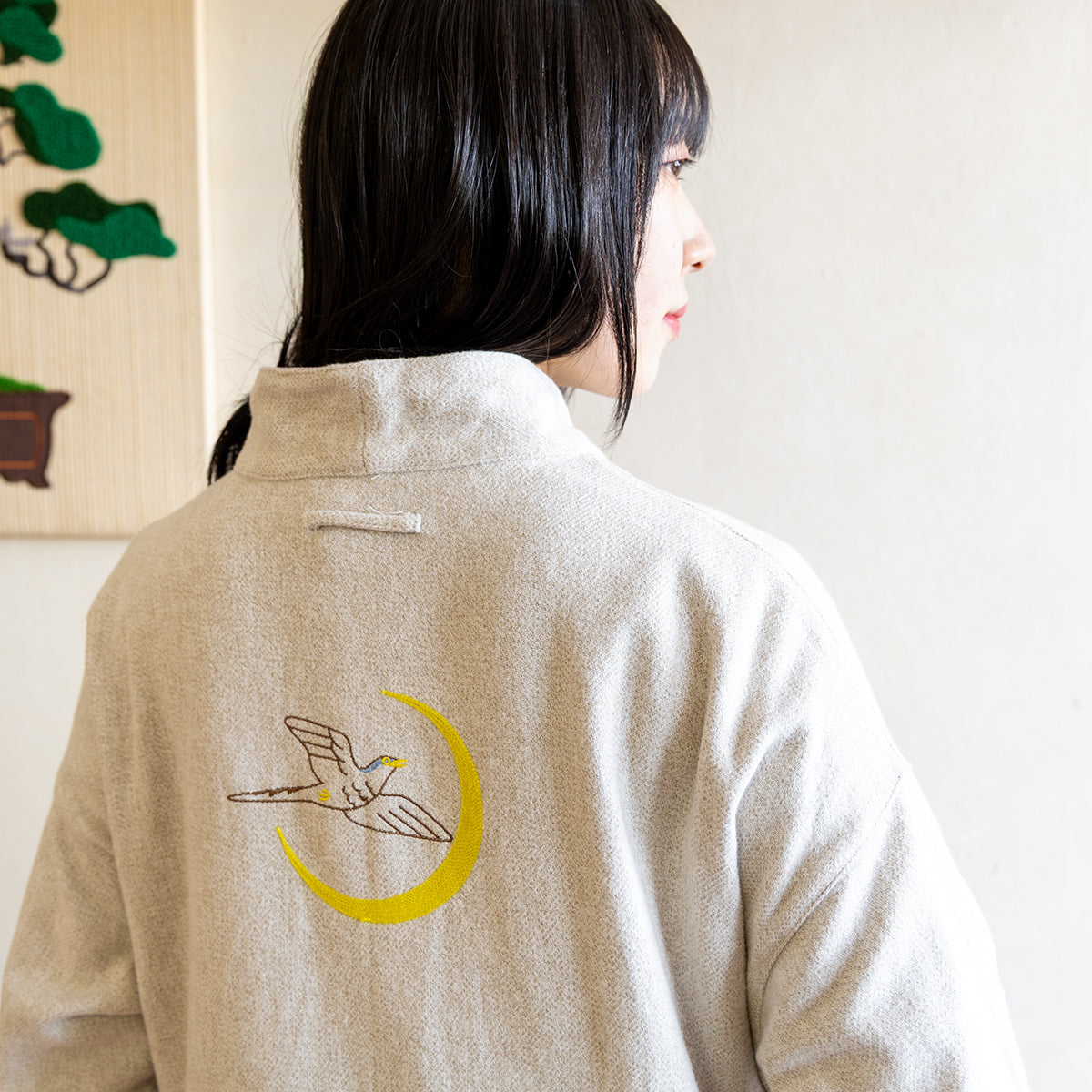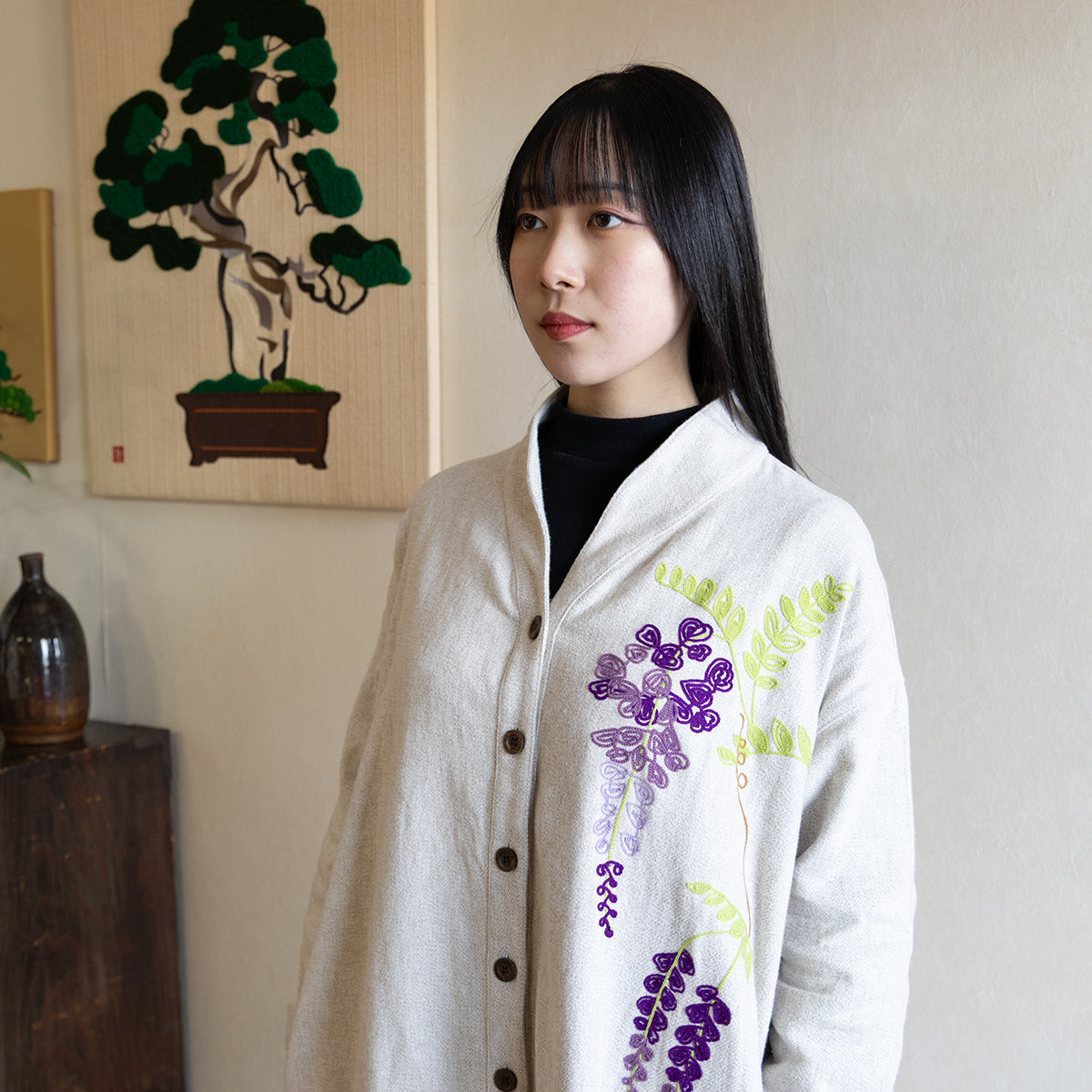 A long coat in soft-hued cotton tweed, embroidered with wisteria in chain stitch. On the back, a motif of the moon and a cuckoo is embroidered. Simply drape it over your shoulders for an elegant and refined look.
